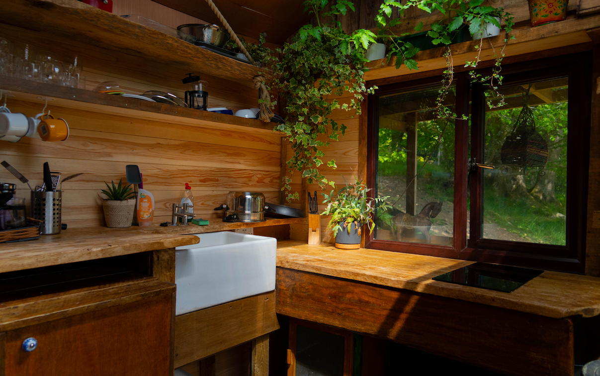 The are two kitchen areas, the Kitchen/workshop Cabin located in the heart of the site and the converted barn kitchen located near the yurts. Both areas are very well equipped for small or large groups.